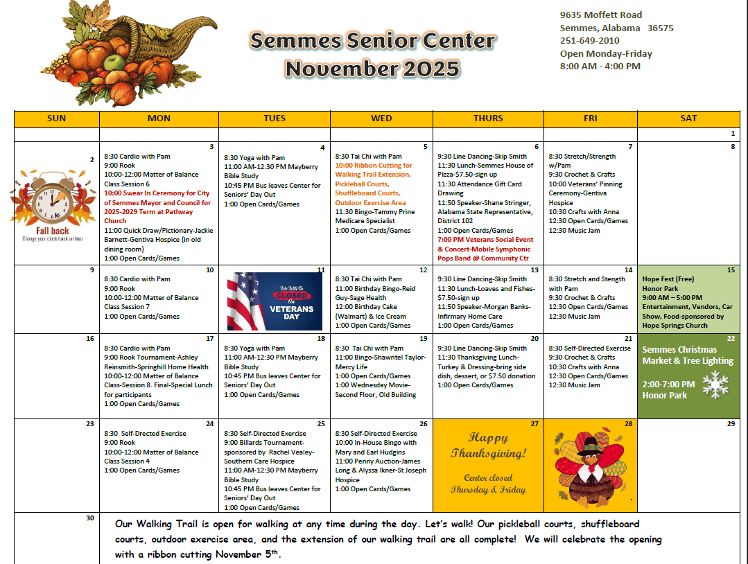 Semmes Senior Center is an integral part of the community and is a busy hub for local senior adults to enjoy. It is a warm, welcoming place where they feel a sense of belonging and feeling like family. It provides them with opportunities for mental stimulation, physical fitness, socialization, fun games, and entertainment. Speakers and classes are scheduled regularly to present relevant information and promote awareness of nutrition, health issues, fraud protection, financial issues, current events, computer skills, and other items of interest such as gardening and genealogy. Special events that encourage participation and fellowship are scheduled often.